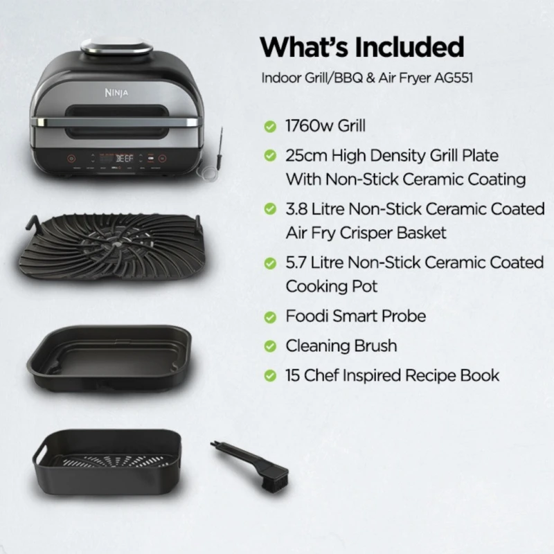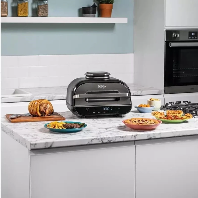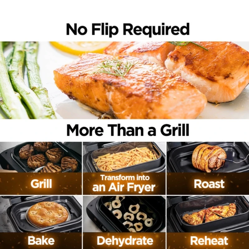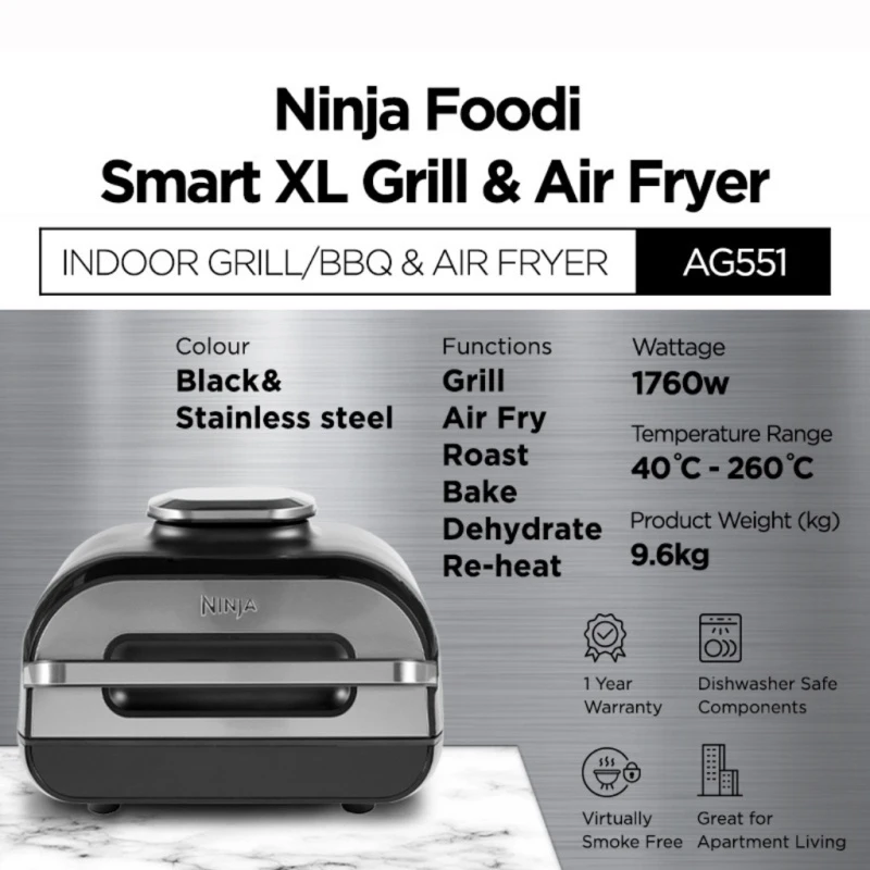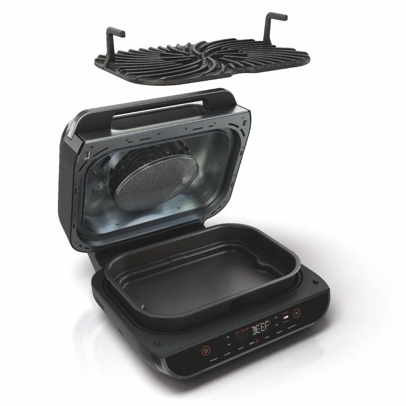 گریل نینجا مدل DG551 با طراحی شیک و منحصر به فرد به رنگ استیل و خاکستری جلوه لوکس و جذاب به دکوراسیون آشپزخانه شما می بخشد. این دستگاه از نوع رومیزی و جمع و جور بوده که روی پیشخوان یا میز آشپزخانه فضای زیادی را اشغال نمی کند. صفحات این گریل از ظرفیت خوبی برای طبخ مواد غذایی برخوردار بوده و تا 6 استیک، حداکثر 24 هات داگ را می توان همزمان آماده کرد. همچنین در سینی پخت دستگاه می توان حجم زیادی سیب زمینی خلالی، قارچ خرد شده و غیره را سریع درست کرد.