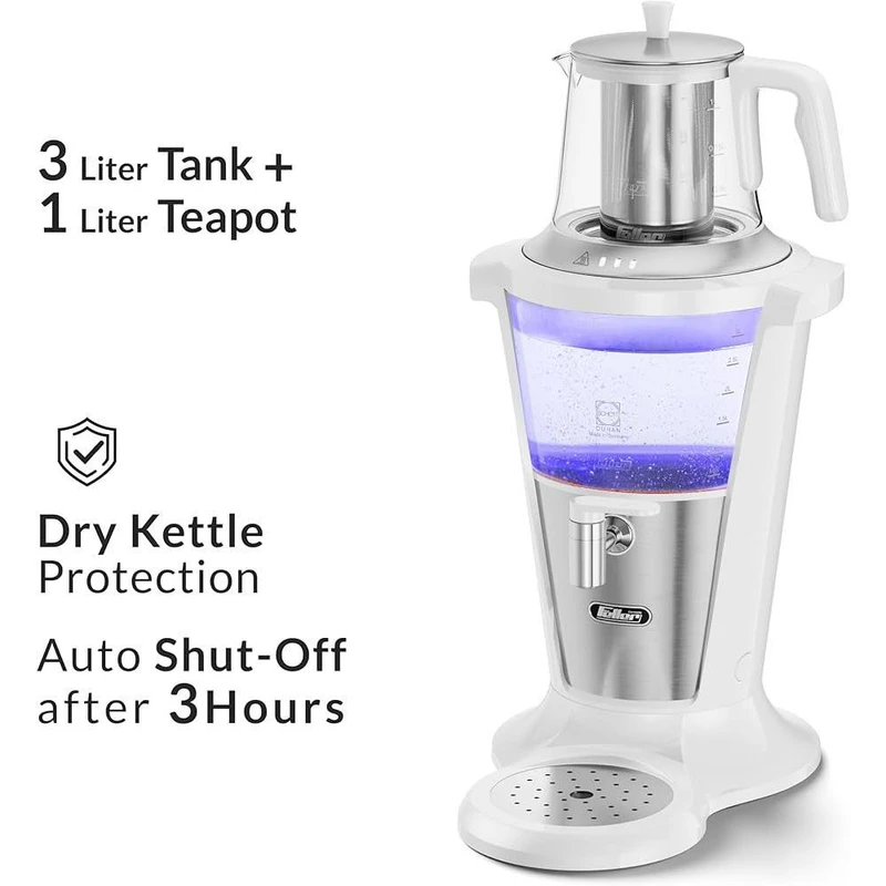 سماور برقی شیشه ای فلر با طراحی زیبا و خوش ساخت جلوه شیکی به آشپزخانه شما می بخشد و بسته به دکوراسیون و سلیقه تان می توانید یکی از دو رنگ مشکی و یا سفید را انتخاب کنید. ظرفیت بالای این سماور و قوری آن را برای خانواده های پرجمعیت و مهمانی ها مناسب کرده است. سماور 3 لیتری و قوری 1 لیتری تجربه لذت بخشی از دم کردن چای و به حداقل رساندن پر کردن مجدد را فراهم می کند.